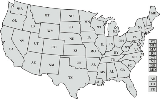 Washington Oregon California Idaho Nevada Montana Wyoming Utah Colorado Arizona New Mexico North Dakota South Dakota Nebraska Kansas Oklahoma Texas Minnesota Iowa Missouri Arkansas Louisiana Wisconsin Illinois Mississippi Michigan Indiana Kentucky Tennessee Alabama Ohio West Virginia Georgia Florida New York Pennsylvania Virginia North Carolina South Carolina Vermont Maine New Hampshire Massachusetts Rhode Island Connecticut New Jersey Delaware Hawaii PR Maryland Alaska